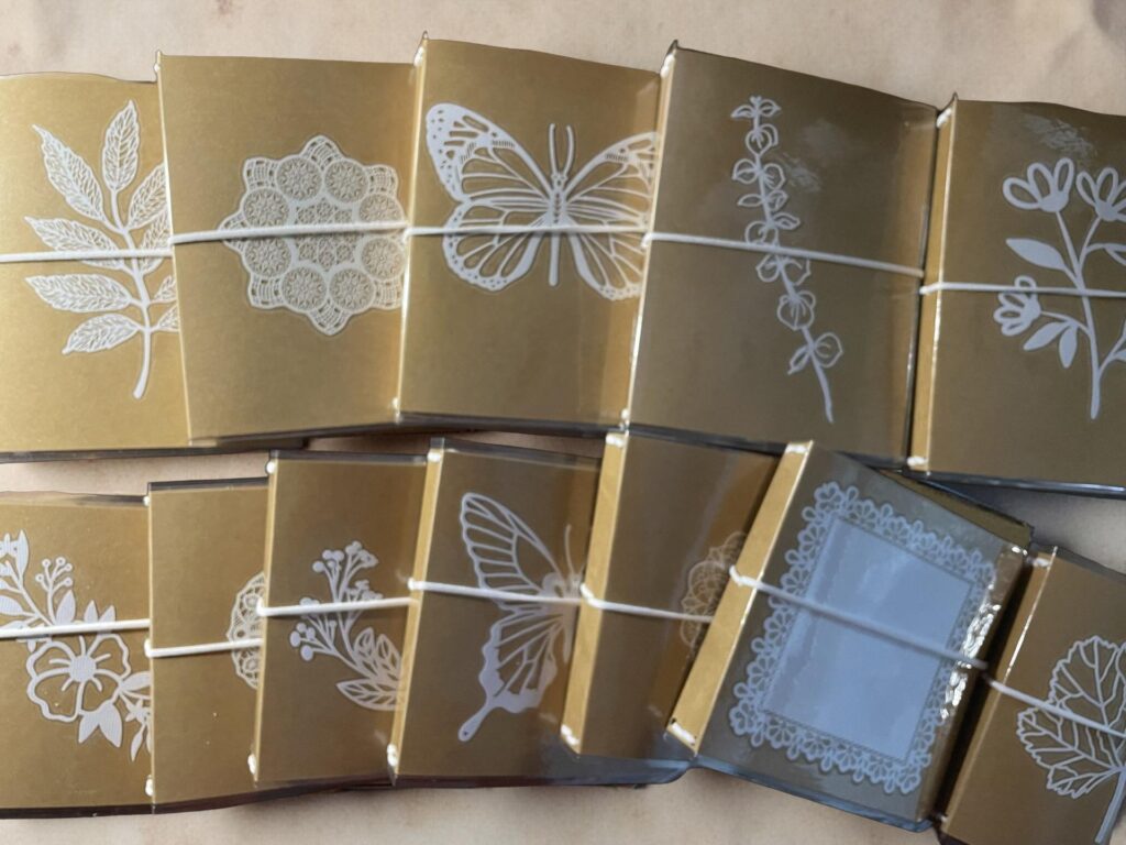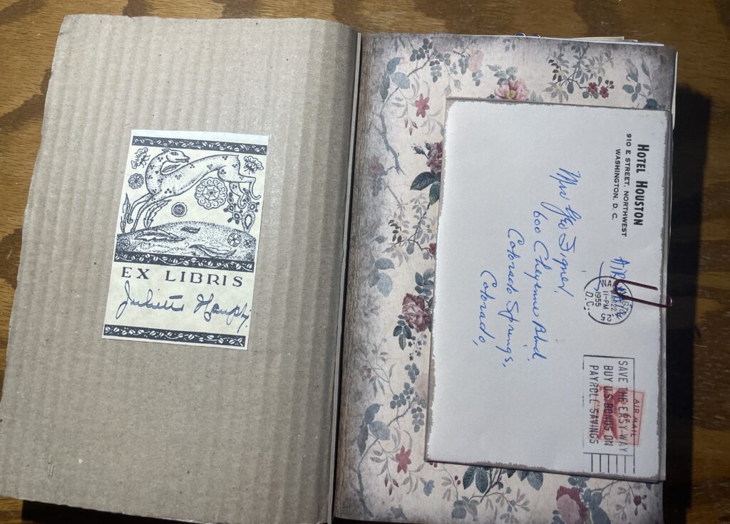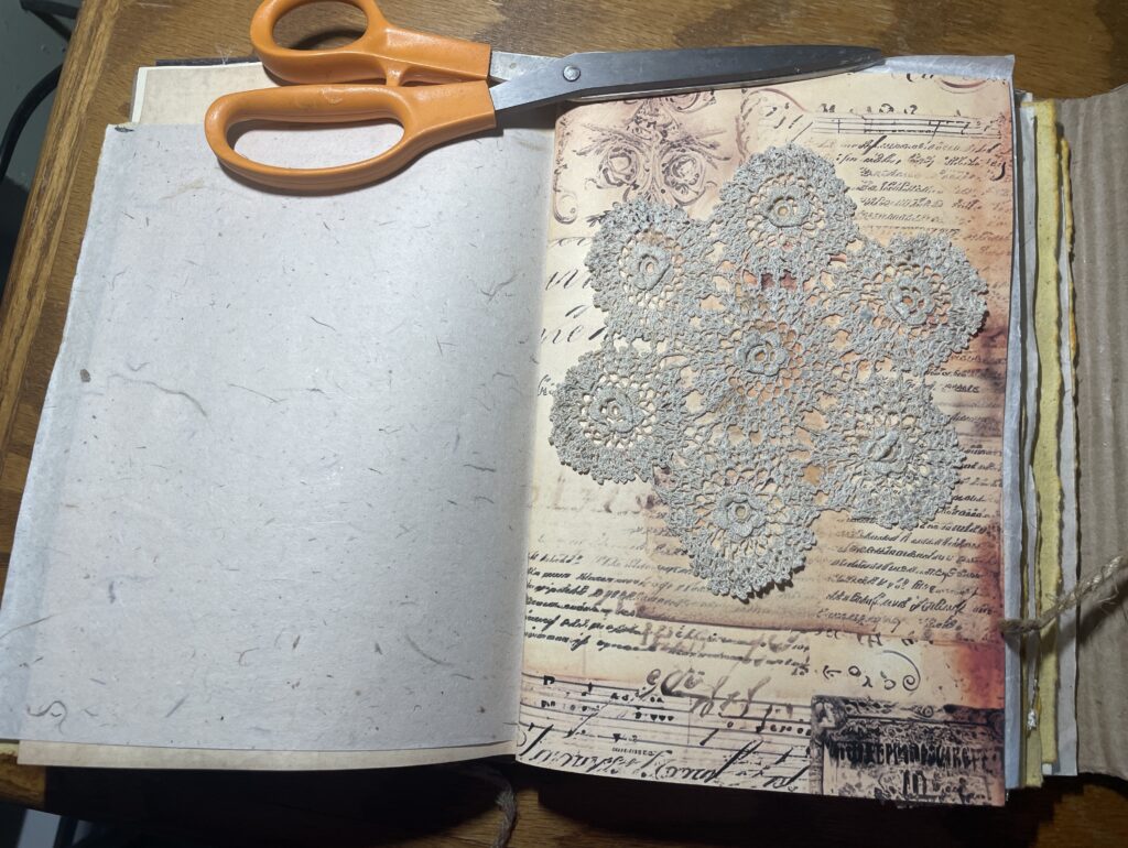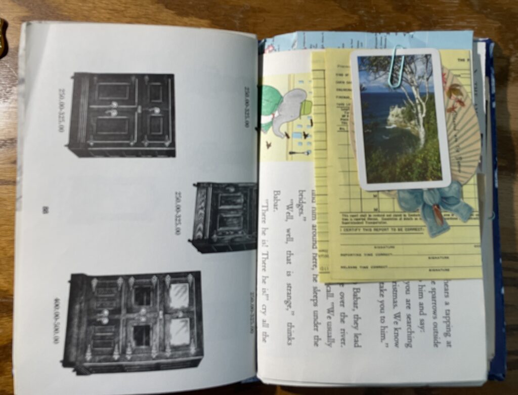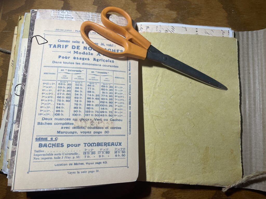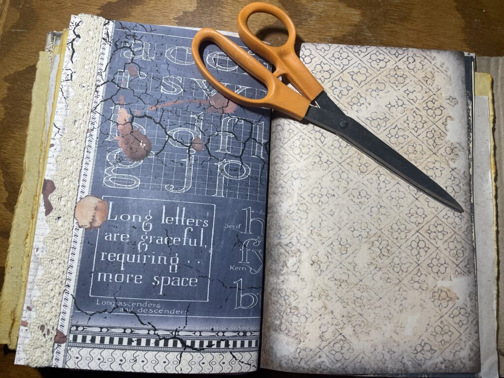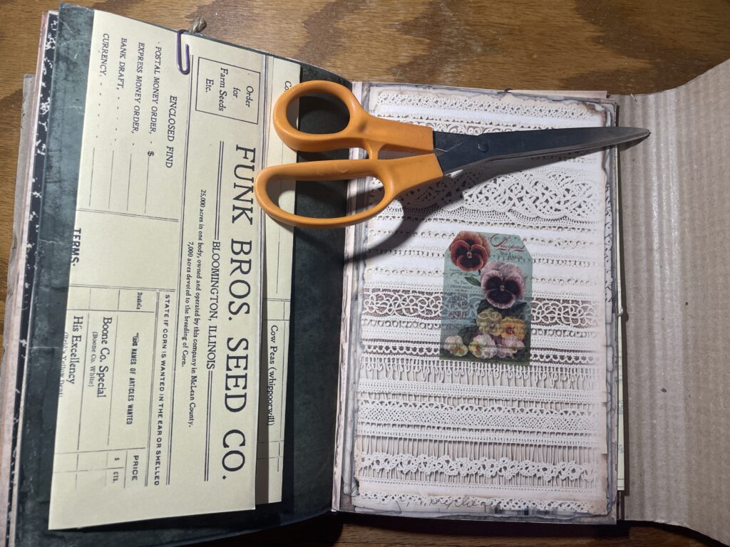 Inside I use a selection of pages, including tea dyed paper, pages from books and magazines, and any kind of older paper I can source that is evocative of a bygone era. I then add real (as opposed to printed) ephemera that I purchase online and find at thrift stores and yard sales. The covers are decorated, but they are neutral with no theme.