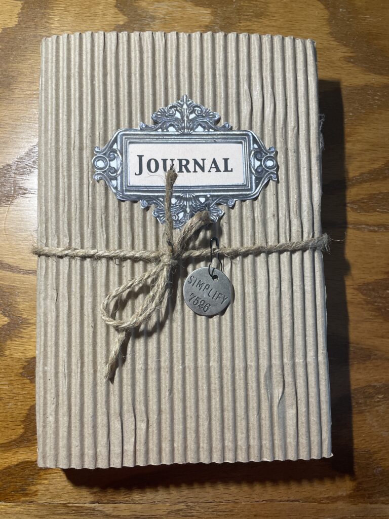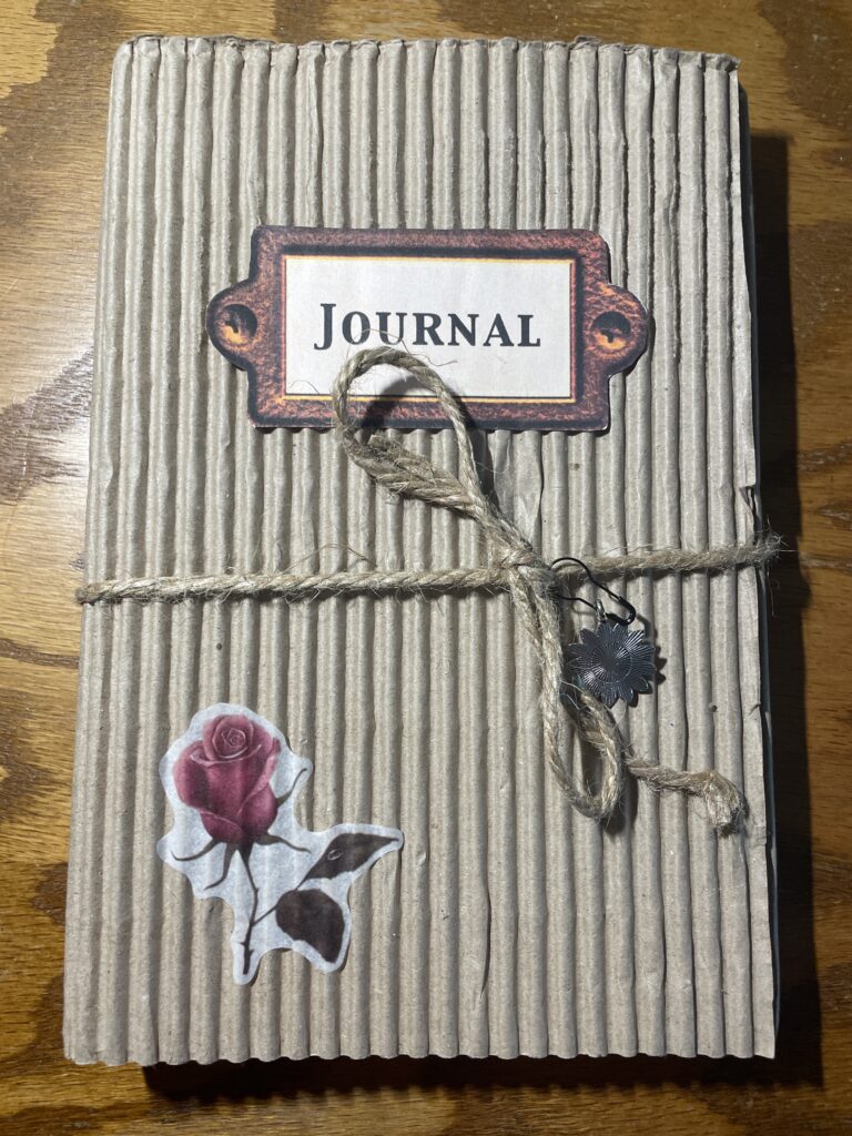The next kind of journal I make is based on the traditional junk journal. Instead of rigid book boards for the cover and spine, I use crinkly delivery bags, boxes, and recycled cardboard to create covers. I do reinforce the spine from from the inside so it keeps its shape.